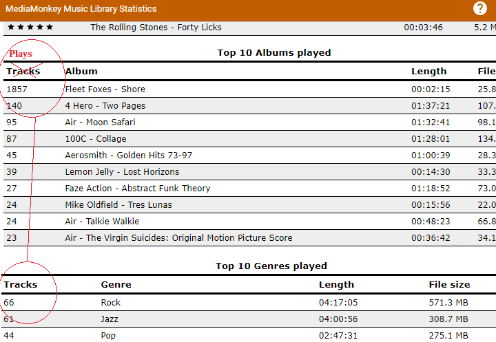 B) The issue is that for the Top 10 statistics the column Played (counts total amount of plays for the value) doesn't match the statistic provided by Length and File Size (which counts for files).