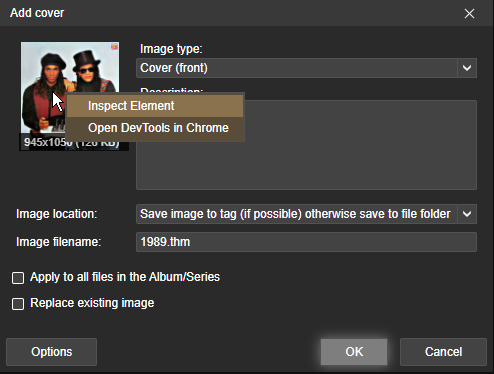 | Description | Add cover dialog should be improved, especially if user Click on Artwork save icon in preview Window i) Image thumb do not have "Show full size". User can't double click/right click on Thumb to see/get full fetched size image ii) Right click on Thumb should contain Lookup Image in order to save user numerous clicks (eg. Cancel -> Right click -> Lookup image -> Ok -> Add cover dialog iii) Image Location contain "Save to tag or to folder", "Safe to folder", "Save to tag and folder" the missing case is "Save to tag (if possible)"/"Only save to tag (if possible)" which will not try to save to folder if save to tag fail. | ||||