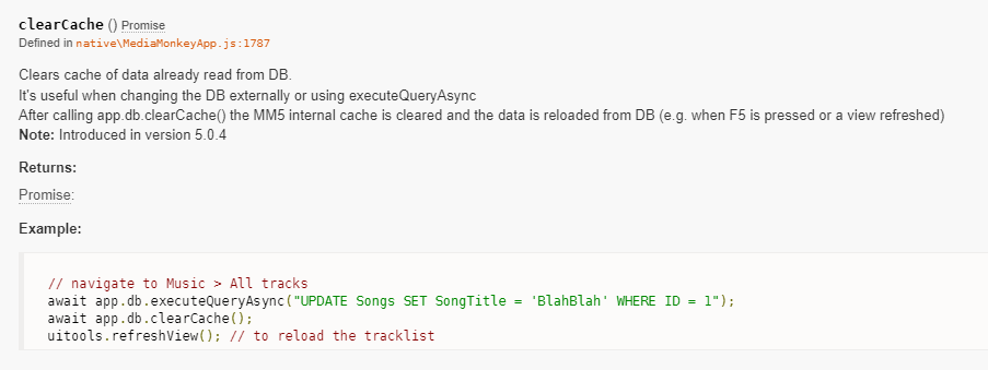 I'll introduce the clearDataCache method into next build, example: // navigate to Music > All tracks await app.db.executeQueryAsync("UPDATE Songs SET SongTitle = 'BlahBlah' WHERE ID = 1"); await app.db.clearDataCache(); uitools.refreshView(); // to reload the tracklist |