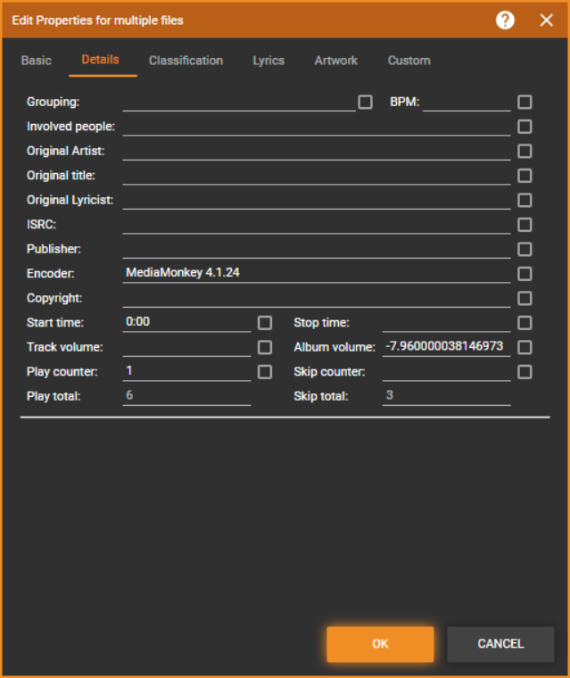 Displaying the total number of plays of an album or group of songs can be valuable, but if editing the value applies the same number to each song, that is logically inconsistent. Perhaps we can split it into two fields: Play counter, which shows the played # of each individual track; and Play total, which shows the total played # of all the selected files. The latter should only appear if multiple files are selected. This way, we can make Play counter behave the same as all other fields (Show a number if all selected tracks share the same value; leave empty otherwise); while still showing the total played # for all selected songs. If we do this, we might like to consider swapping the rows for Track/Album volume with Play/Skip counter, so that we stay visually consistent with the optional Bookmark row (keeping optional rows at the bottom) while keeping the Play/Skip rows together. |