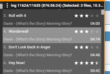 A couple of points: 1) It's not great that the text overflows when multiple tracks are selected 2) The most useful bit of data (in this context) when multiple tracks are selected is the # tracks and the time. 3) Ideally selection should be consistent With the above in mind, perhaps when NP track(s) are selected, MM temporarily replaces 'Playing 3/5 (hh:mm:ss)' with 'Selected: x files, hh:mm:ss)'. And reverts to the normal header after x seconds. This would solve all of the above issues. Thoughts? |