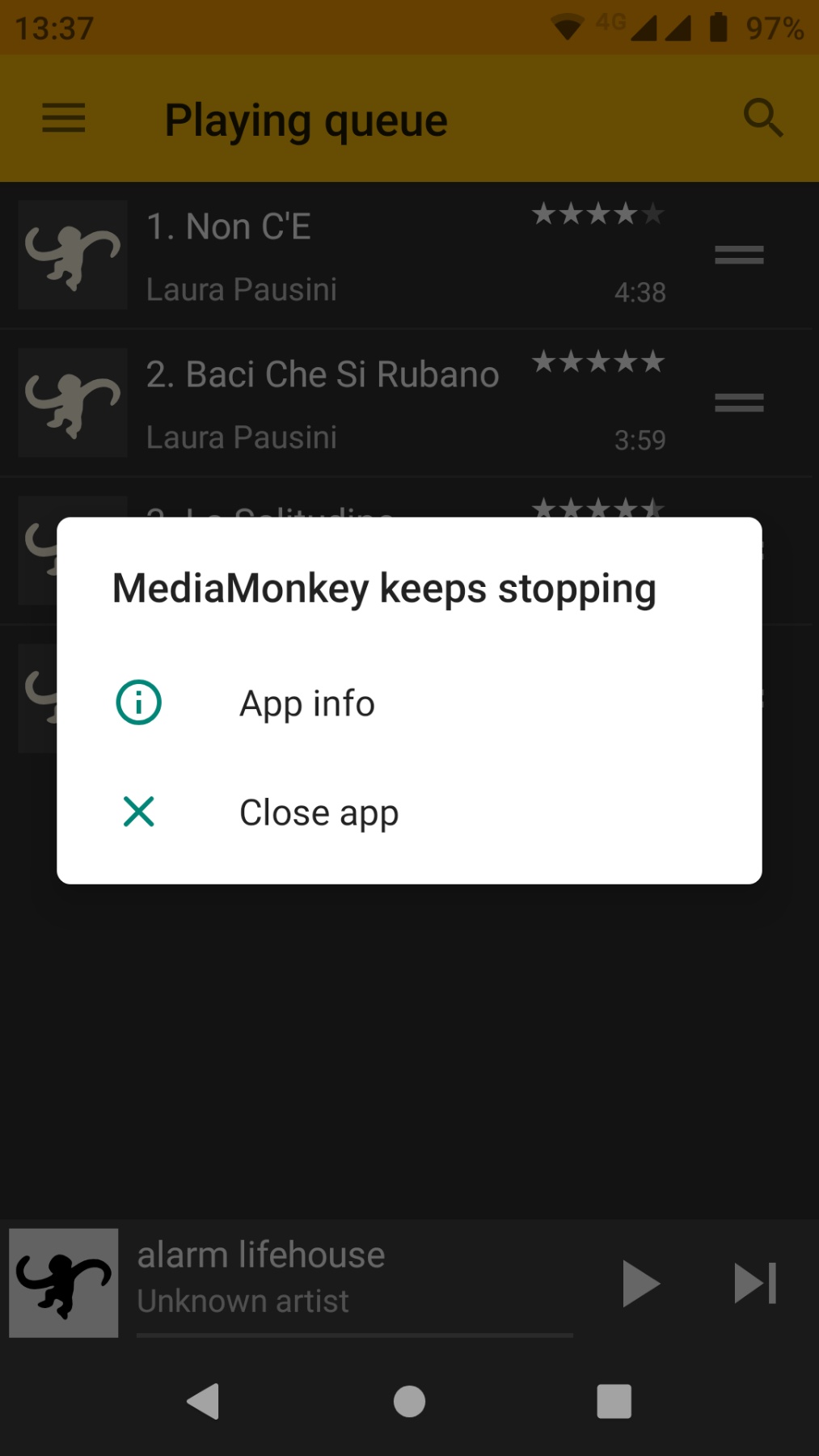 | Steps To Reproduce | 1. Open MMA (commonly it reports crash log sent), but opens 2. tap on playback queue 3. tap on track to play 4. crash 5. try again -> error pops (app keeps crashing CLOSE APP) 6. start again 7. press play -> it plays (crashlog sent) 8. open playing queue -> error pops (app keeps crashing CLOSE APP) Multiple Auto Logs sent. Case 2: 1. Browse playlists 2. Tap one track to play 3. Crash Case 3: 1. Browse some tracks 2. Play tracks 3. Press QUEUE TAB 4. Crash -> MMA restart -> Error dialog | ||||
