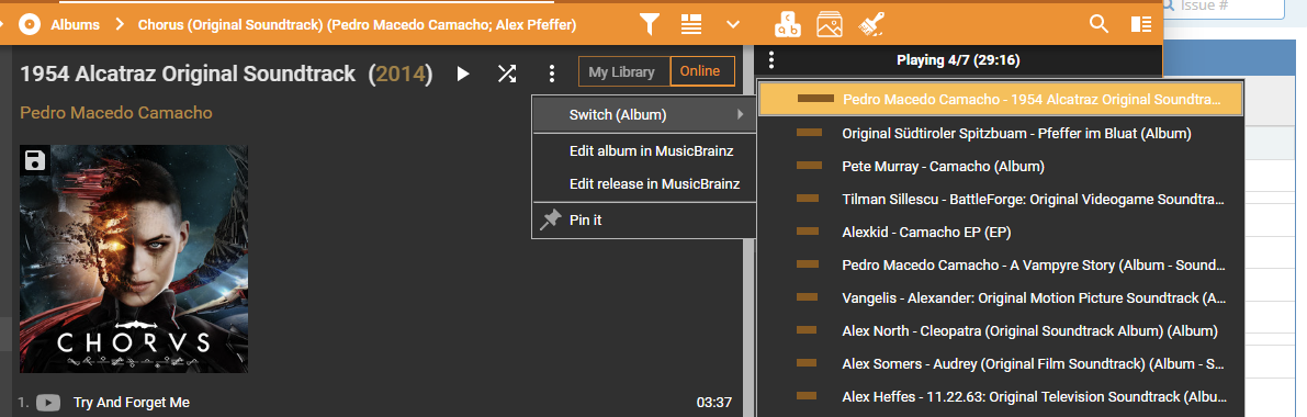 Assigned to Michal to review, but it looks like the 'Alcatraz Original Soundtrack' is the only album found from artist 'Pedro Macedo Camacho' in MusicBrainz? Thus the 'Chorus' soundtrack is not shown? In that case we should rather show just the album name / art with no tracks and a message that the album hasn't been found in MusicBrainz? Please review... |