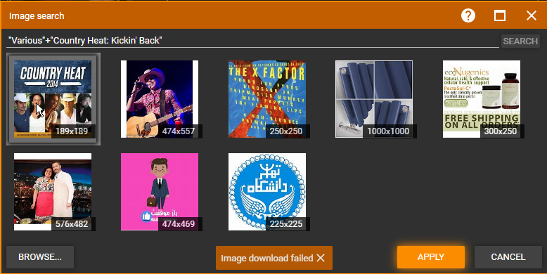 | Description | Image Lookup: Double clicking on found image generate download error. Start Lookup Image and in search term enter["Various"+"Country Heat: Kickin' Back"] then double click on First found image it will return download failed. Immediately Repeating Double click will download it normally. I also noticed that res of Image changed before second double click. Before first double click it showed 250x249 and before second 189x189 | ||||