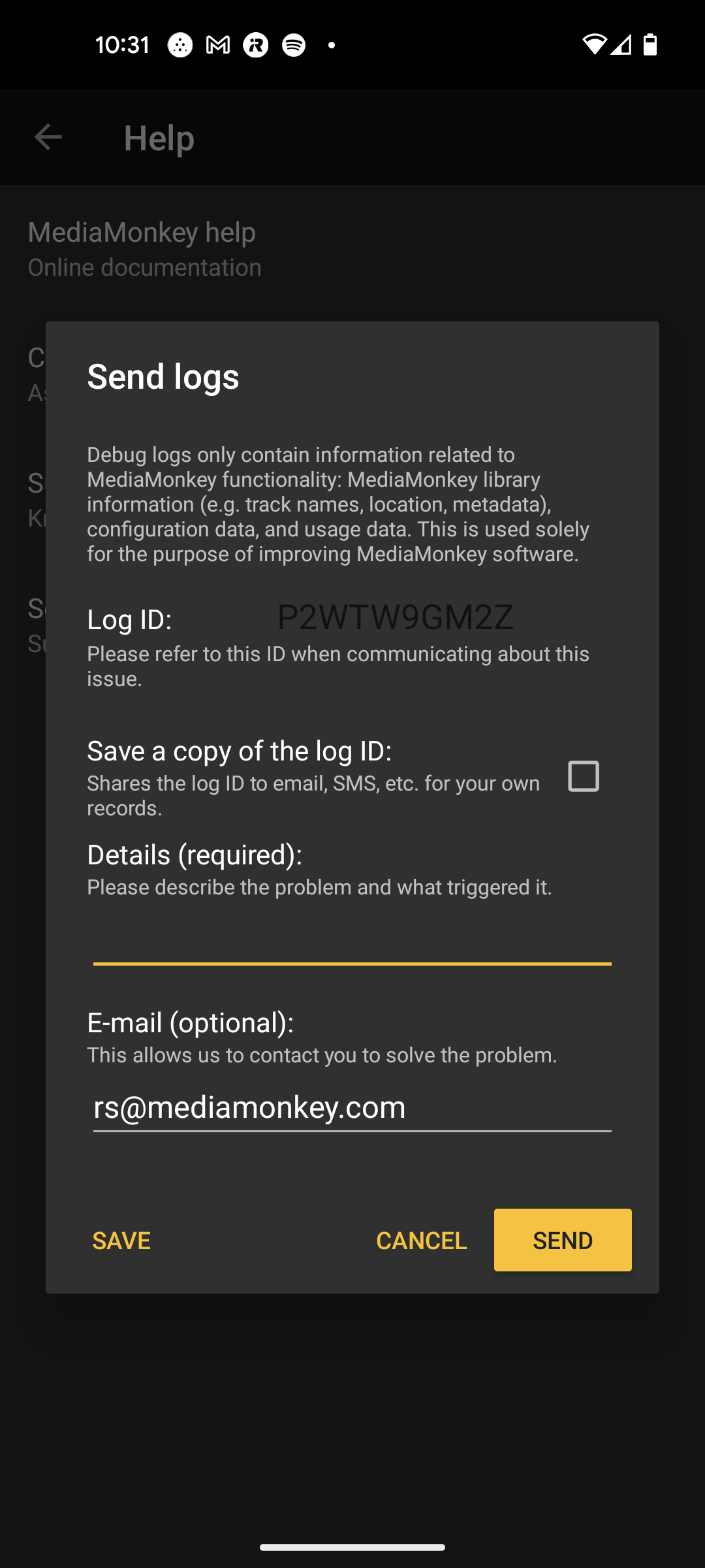 There's another skin bug when Dark mode is enabled--it's difficult to see the Log ID at Options > Help > Send logs