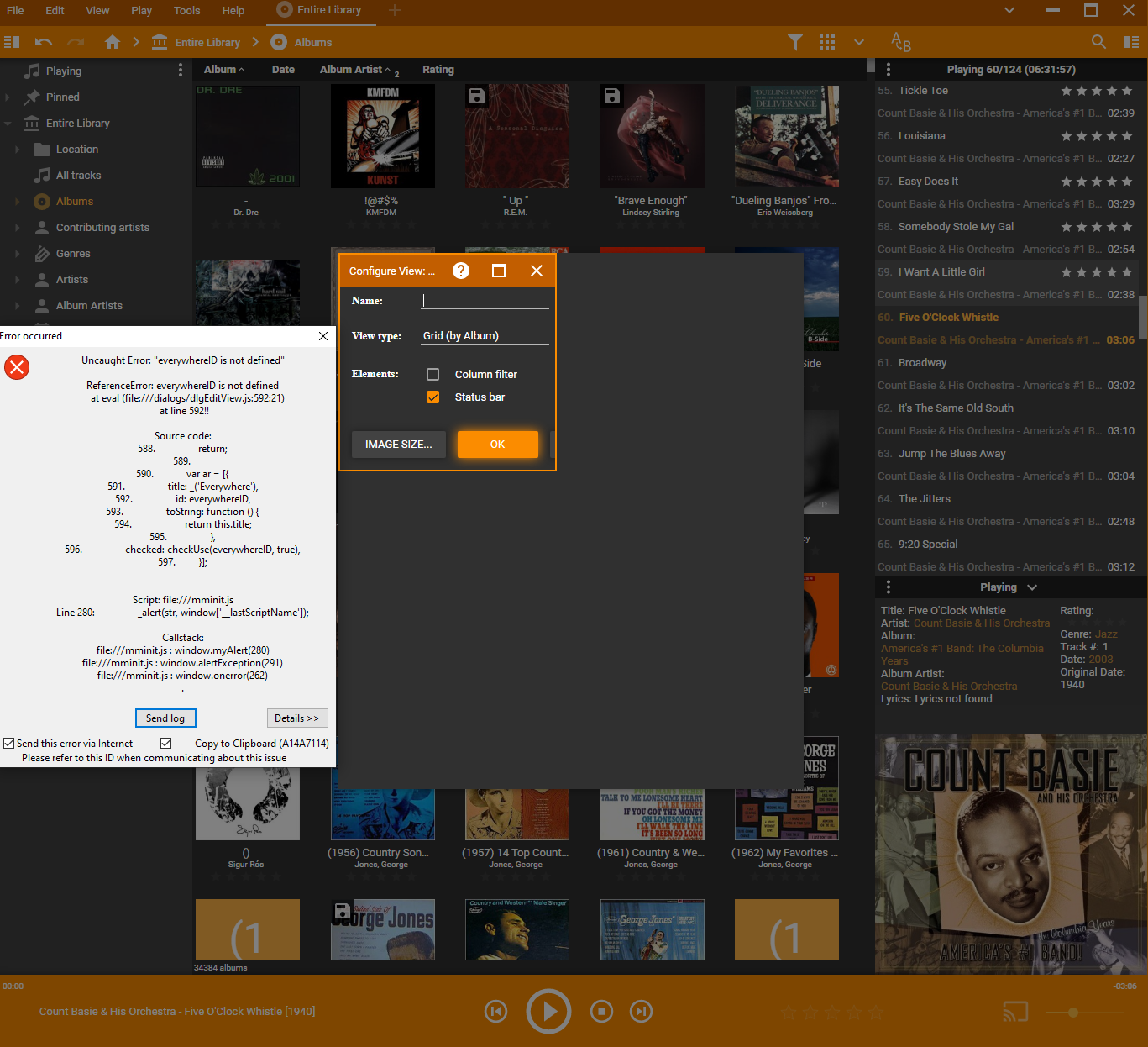 I can't replicate and I don't see A14AE7FD submitted here, but based on the same exception ID from 1802 it is rather AV related to outdated "3D Album view" addon. Please upgrade this addon: https://www.mediamonkey.com/addons/browse/item/3d-flow-album-view/ and test whether you can still replicate the crash. |