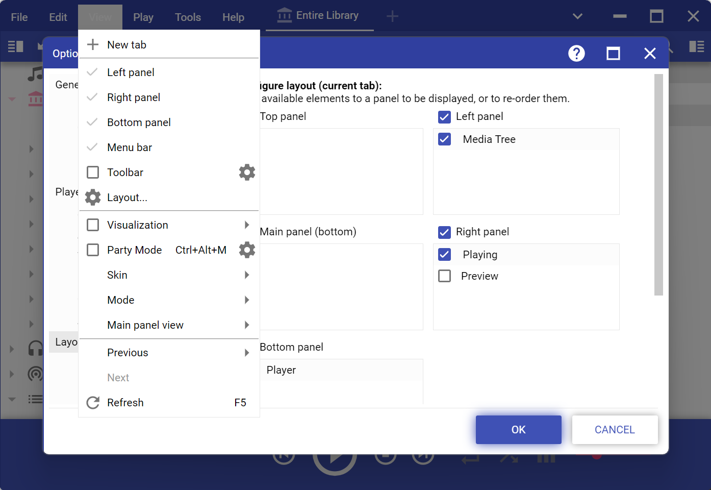 | Description | If you click on the gear icon of e.g. View / Skin / Material Design or View / Mode / Desktop, the Options dialog box will be opened but the menu will be still on the top. That menu will be on the top even if you switch to another program. The View / Toolbar or Play / Play to / Internal player gear icons don't have this problem. | ||||