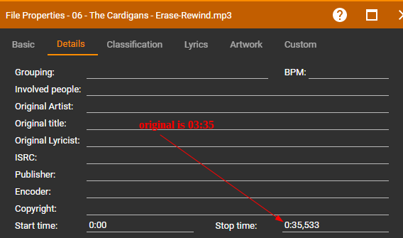 On 2815 the Seekbar shows just the time between Start and Stop time as specified. 1) However, this means a user can't seek before Start time or after Stop time if they wish to do so as this isn't available on the Seekbar. Instead it would be better if the Seekbar shows full file, and instead shows markers for Start/Stop Time or a different color shade for Start/Stop time segments of the file. This would visually indicate the Start/Stop Time, but also allow users to still seek in those segments. 2) Bonus would be if user can adjust Start/Stop time by moving marker on seekbar. 3) Length field should maybe show playable times/full file length, where full file length shows greyed out. |