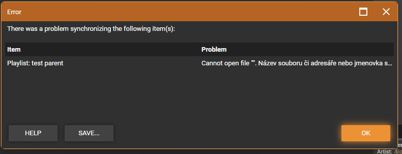 | Description | 1) Set up a sync profile like 'Google Drive' or 'OneDrive' 2) On the 'Library Content' tab select a 'Parent Playlist' that has sub-playlists but does not include any files 3) Click [Apply] and then [Sync now] => Sync finished, but a problem synchronizing Parent PLaylist is reported in the Error dialog window | ||||