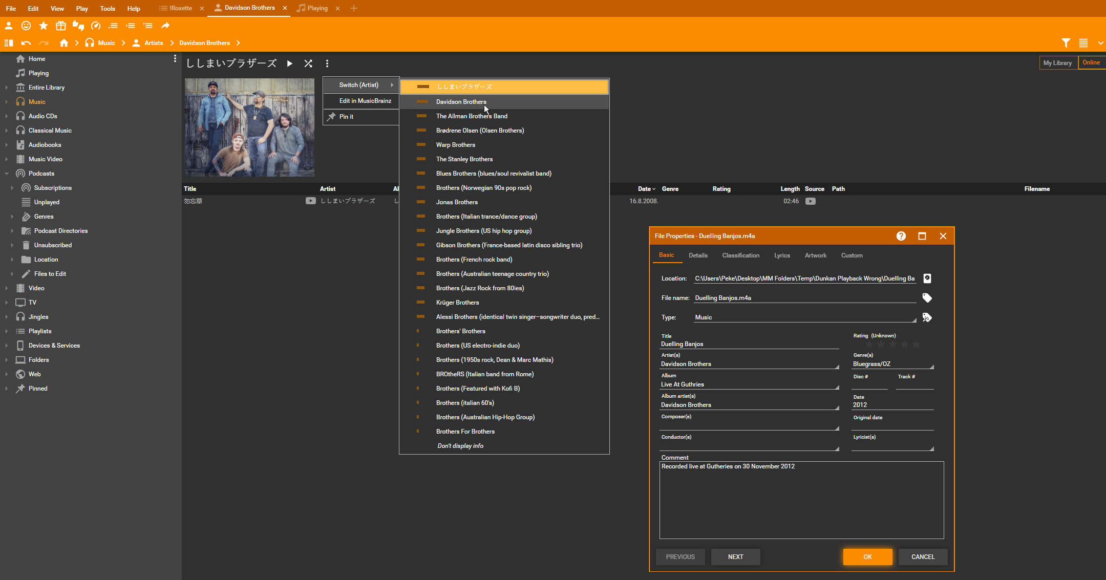 FMFS tries to find artist in library, and if not present, it is searching in MB DB. The problem is on our MB server side, it should not prefer different name over the same name. Assigning to Petr to look at it. Original MB server returns correct "Davidson Brothers" artist, our server some "Shishimai Brothers" (in EN transcription). |