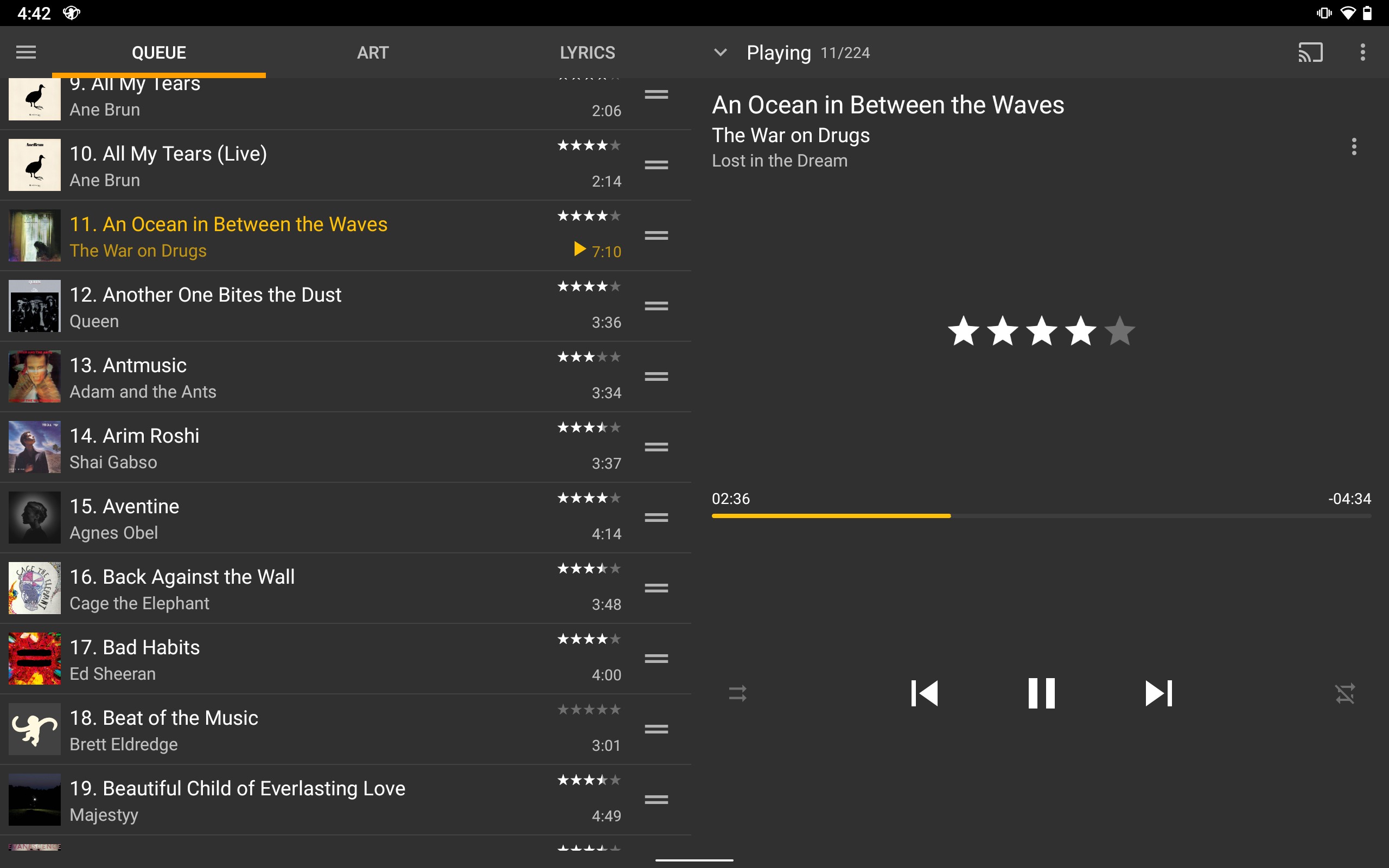It would be preferable to just merge the Artwork view with the Queue/Lyrics views. The way that this could work is that for tablets with screen that are 'large enough' in landscape view, the 'Playing' view would display only two Tabs: Queue + Lyrics, with the content displayed in the middle panel; and the right-panel would display the Artwork/Player (for both the Queue and Lyrics tabs). The only downside with this approach is that in the long term as Android becomes the OS for chromebooks and MMA gains more desktop-like functionality, we may want MMA to be able to have an Artwork view associated with other views as well (like MMW), in which case this approach might conflict. |