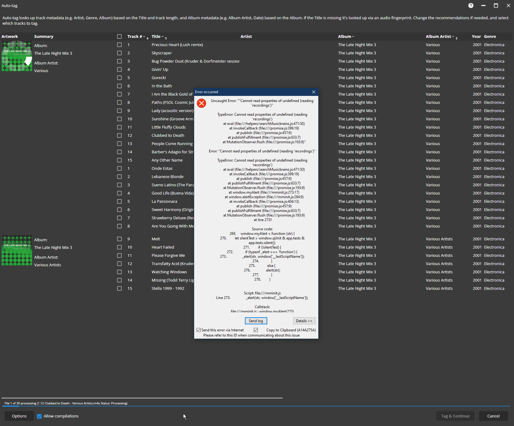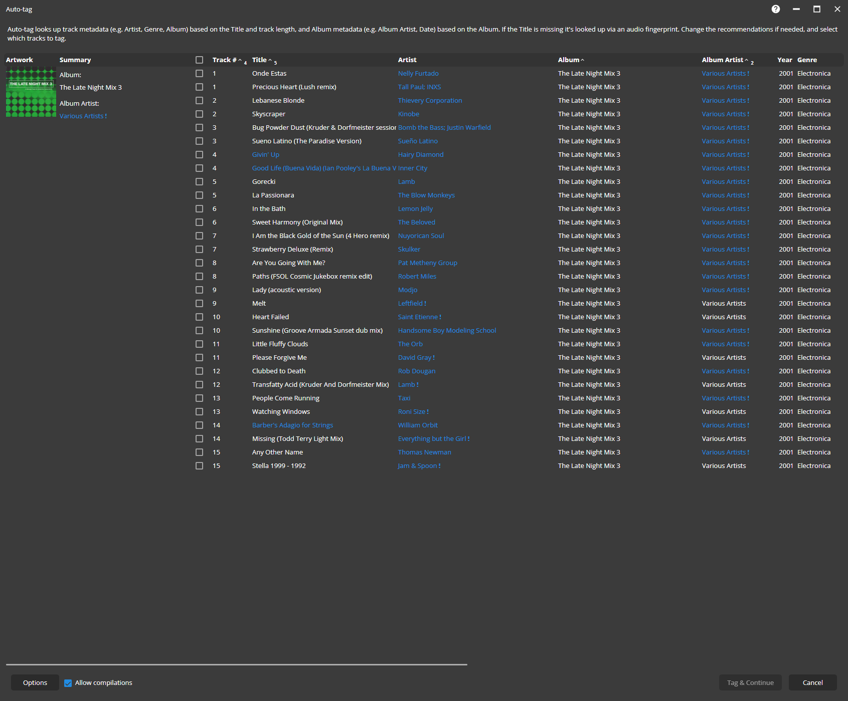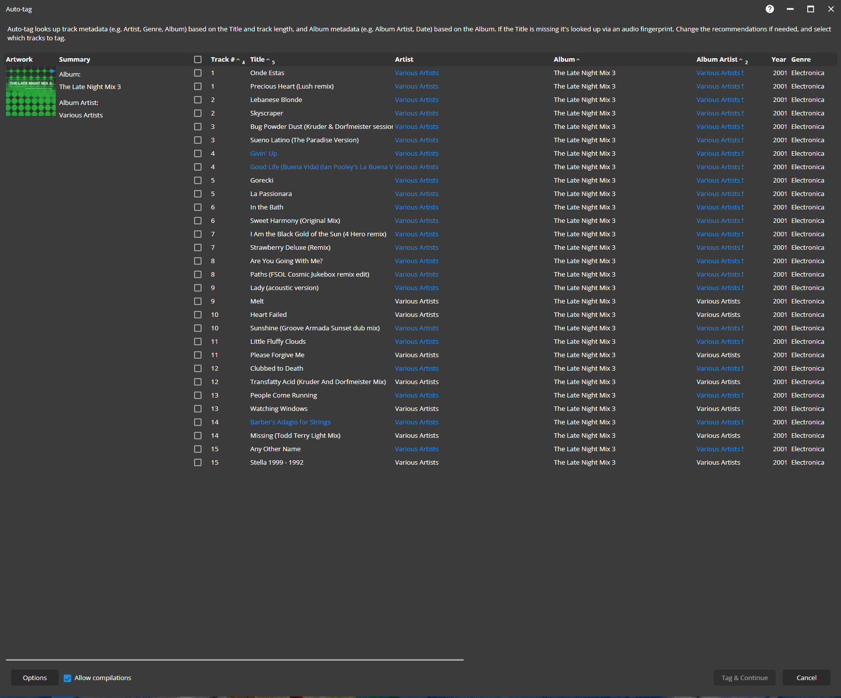 | Description | Some Multi CD compilation Albums fail to Auto-Tag eg. even Disk Numbers were correct they are lost on Auto tagging and sometimes MM incorrectly Assign Wrong Artist to tracks. Sample Album in Question is: https://musicbrainz.org/release/4f20bbd4-a0b2-45f3-8aa2-0ff8729db23e https://www.discogs.com/release/8084123-Various-The-Late-Night-Mix-3 | ||||