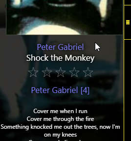 | Description | Playing node / Album Art view - the left panel with smaller album art, track info and lyrics has horizontally centered album art related to that panel without its vertical scrollbar. However, text of lyrics and, I suppose, other displayed fields (artist, title, rating...) are centered to the panel taking in account its scrollbar. You should either change centering of album art or other displayed fields, to be consistent. | ||||