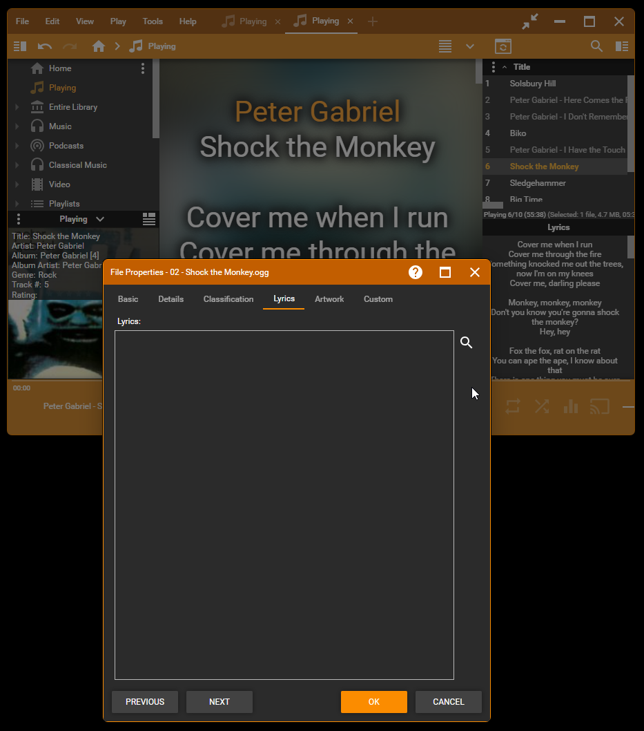 I just removed and added the same file, then restarted the program. Then I opened and closed the Addons dialog box 4 times. On the 4-th opening, the addon thumbnails was missing in that dialog box, and Lyrics is missing in the Properties dialog box, but it is still displayed on the main window (1-st screenshot). After I choose Quick window reload with the Refresh Skin Shortcut add-on, Lyrics is missing in the Properties dialog and everywhere in the main window, artwork is missing everywhere in the main window, but not in Properties dialog (2-nd screenshot); After changing the skin, everything is the same as on the second screenshot (3-rd screenshot). After restart, everything is fine. I just tried again the same steps, but without using Refresh Skin Shortcut add-on, to eliminate its influence, and after changing the skin I got the same situation as on the 3-rd screenshot. Keep in mind i am using the last released version (3005), but you are mentioning 3006 in the linked issue. |