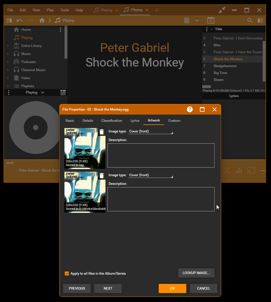 I am unable to replicate :-/ BTW: " "Apply to all files in the Album/Series" option" should have no effect as in the 'Preview' panel the thumb is shown per track (not per album) Could you please share more info? Ideally screencast video ( plus debug log, sample tracks) so that we could replicate and fix this issue? Thanks! |