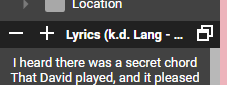 | Description | If the Preview and Playing panels and Player are hidden from the window, there is no any indication what song is playing, even if the Lyrics panel is displayed. And when the playing track doesn't have lyrics, there is displayed "Lookup" and nothing more. I think it is obvious that that panel represents the lyrics of the playing song, there is no point for the "Lyrics" to be displayed in the title bar, just like you decided to not include "Preview" in the title bar of Preview panel. I think it would be more useful if the title bar of Lyrics panel displays Title (and maybe Artist) of playing track. | ||||