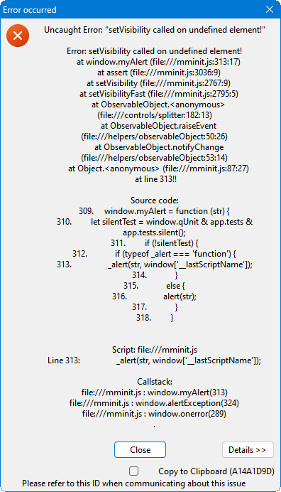 | Summary | 0020974: Uncaught Error: setVisibility called on undefined element! (crash A14A1D9D) | ||||