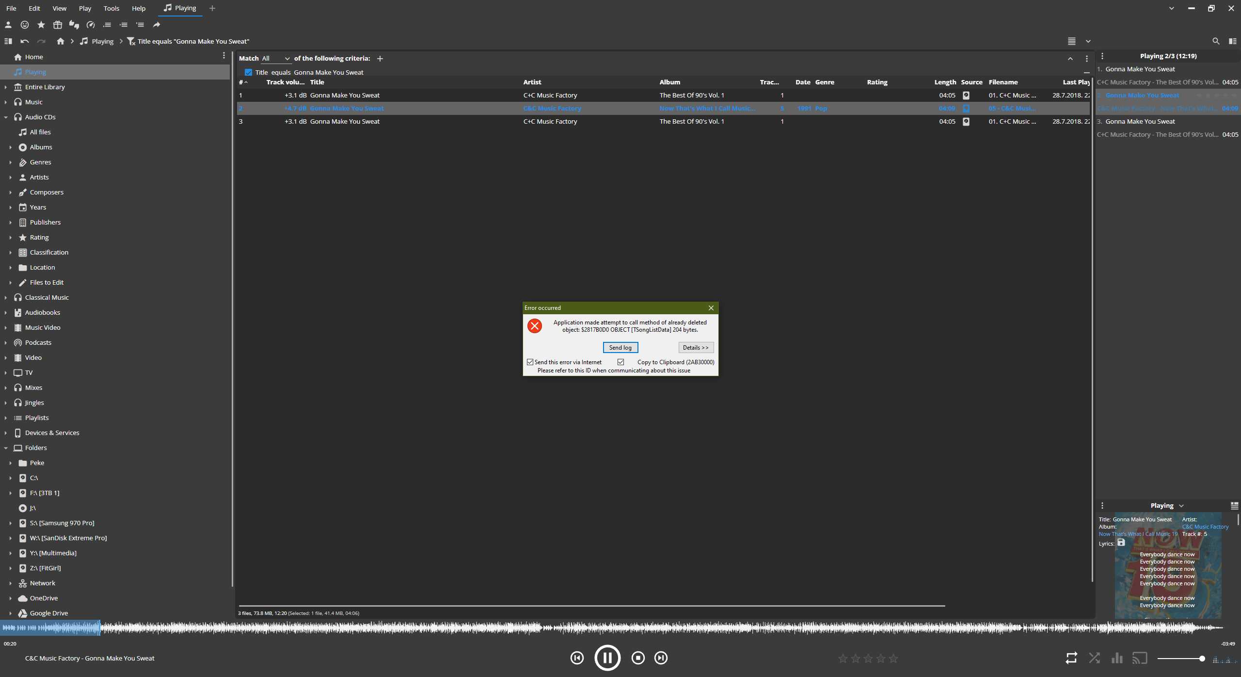 User Carsten has found consistent steps to replicate this crash/regression: 1) Select group of >50 files, right-click > Edit properties 2) Enter a value to Comment field click [OK] 3) Click on a track in filelisting => crash 2AB30000 |