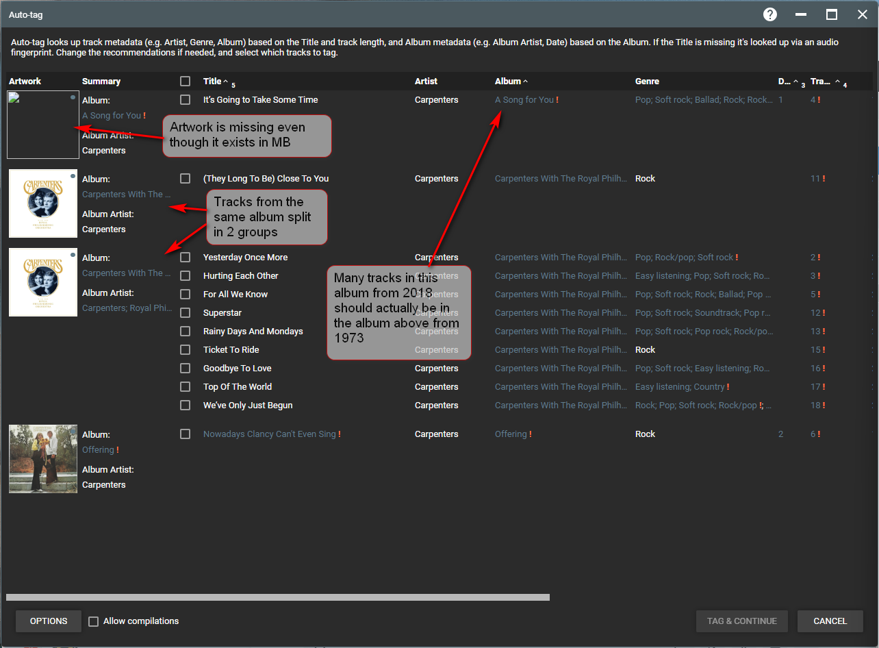 | Description | When 'Carpenters: The Singles: 1969-1973' is auto-tagged with 'allow compilations' disabled, a track gets looked up as part of the album 'A Song for You' ( https://musicbrainz.org/release-group/1d47f2fc-cc62-3462-8c0d-d9259820953f ), but the artwork is shown with a broken link! This also occurs for a number of tracks when attempting to auto-tag 'Beach Boys - Best of the Beach Boys' These bugs occurs consistently for the above tracks, but there was a complaint about this issue by a user as well. See image at: https://www.ventismedia.com/mantis/file_download.php?file_id=5722&type=bug | ||||