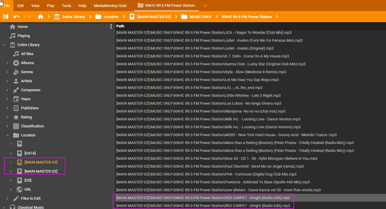 | Steps To Reproduce | One of duplicates found [MAIN MASTER G2]\MUSIC ONLY\KNHC 89.5 FM Power Station\RED CARPET - Alright (Radio Edit).mp3 [MAIN MASTER G2]\MUSIC ONLY\KNHC 89.5 FM Power Station\RED CARPET - Alright (Radio Edit).mp3 | ||||