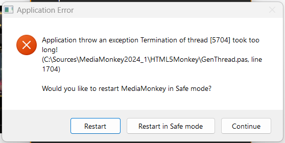 The error has nothing to do with permission, but just before restoring database MediaMonkey asked to terminate all threads and one of the threads took longer than 10 seconds to terminate therefore there was an assert (on debug build), asked user for debug log, without the debug log we simply don't have enough info.. So resolving until we have more info.. |