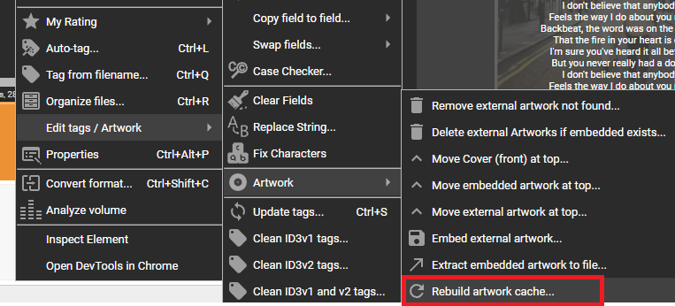 | Description | Taken feature request from MM2026 planned features document: Manual option to rebuild Artwork cache. This could be something a user runs overnight to freshen up the Artwork cache. It would also speed up browsing if users have lots of uncached Artworks. It could be added to 'Edit tags / artwork' > 'Artwork' > 'Rebuild artwork cache' submenu to the other mass artwork edit options already implemented in course of 0021575 | ||||