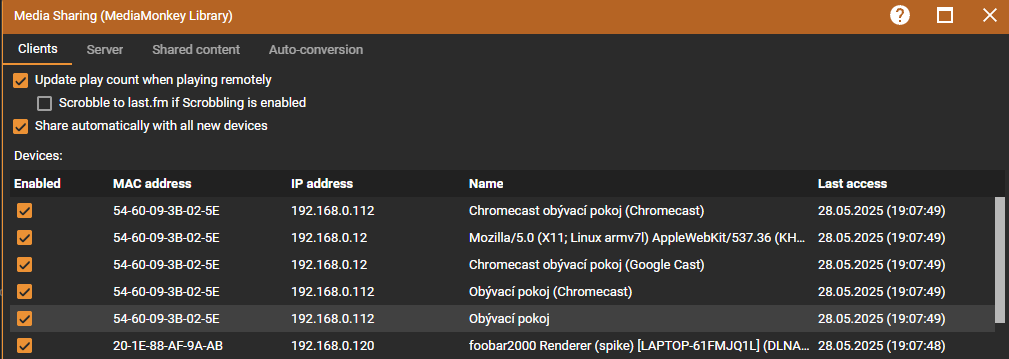| Description | Testing casting and seeing that I have 5 entries for a single Chromecast device (single MAC address and various IP addresses) in Options > Media Sharing > Media Monkey Library > Clients tab (see the screenshot) That's strange as we are using MAC address as the unique identifier so there should be definitely just single entry for single MAC address! | ||||
