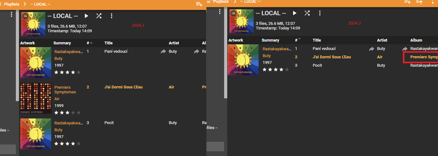 | Summary | 0021630: 'List (by Album)' grouping in playlists fails (regression 2024.2.0.3154) | ||||