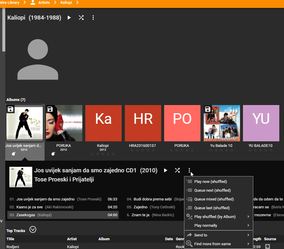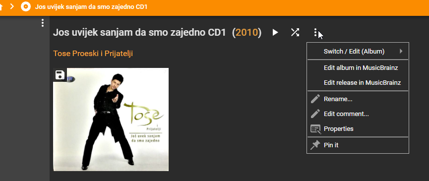 | Description | In Grid Browser views (Home/Artists/...) Albums can be played in multiple ways eg. Normally/Shuffled/Mixed/Shuffled/.... using ⋮ Menu (Image 1) while in Album View Play option is limited to PLAY NORMALLY and PLAY SHUFFLED because no other options are available (Image 2) This should be consistent across MM views where user wants to initiate play action on whole Album | ||||