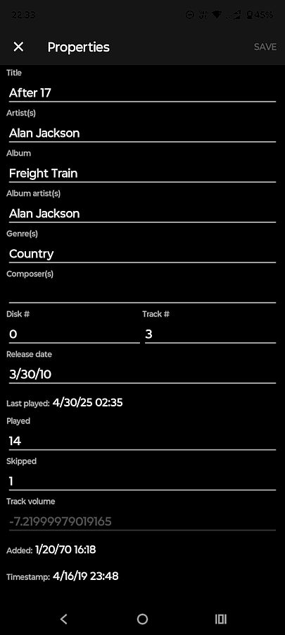 So, in this turn I've added Track # and Disk #, Added, Timestamp (called Modified in the Czech language, should MM5 be unified, or is it intended?) For video type, instead of Artists, Album Artists, Composers, Track # and Disk #, there are Directors, Producers, Actors, Series # and Episode # changed VolumeLeveling -> TrackVolume to unify with MM5 and made as editable field. The edition for TrackVolume, Series # and Episode # is disabled until sync with MM5 is supported. It will be handled in 0021189 Fixed in build 2.1.2.1300 |