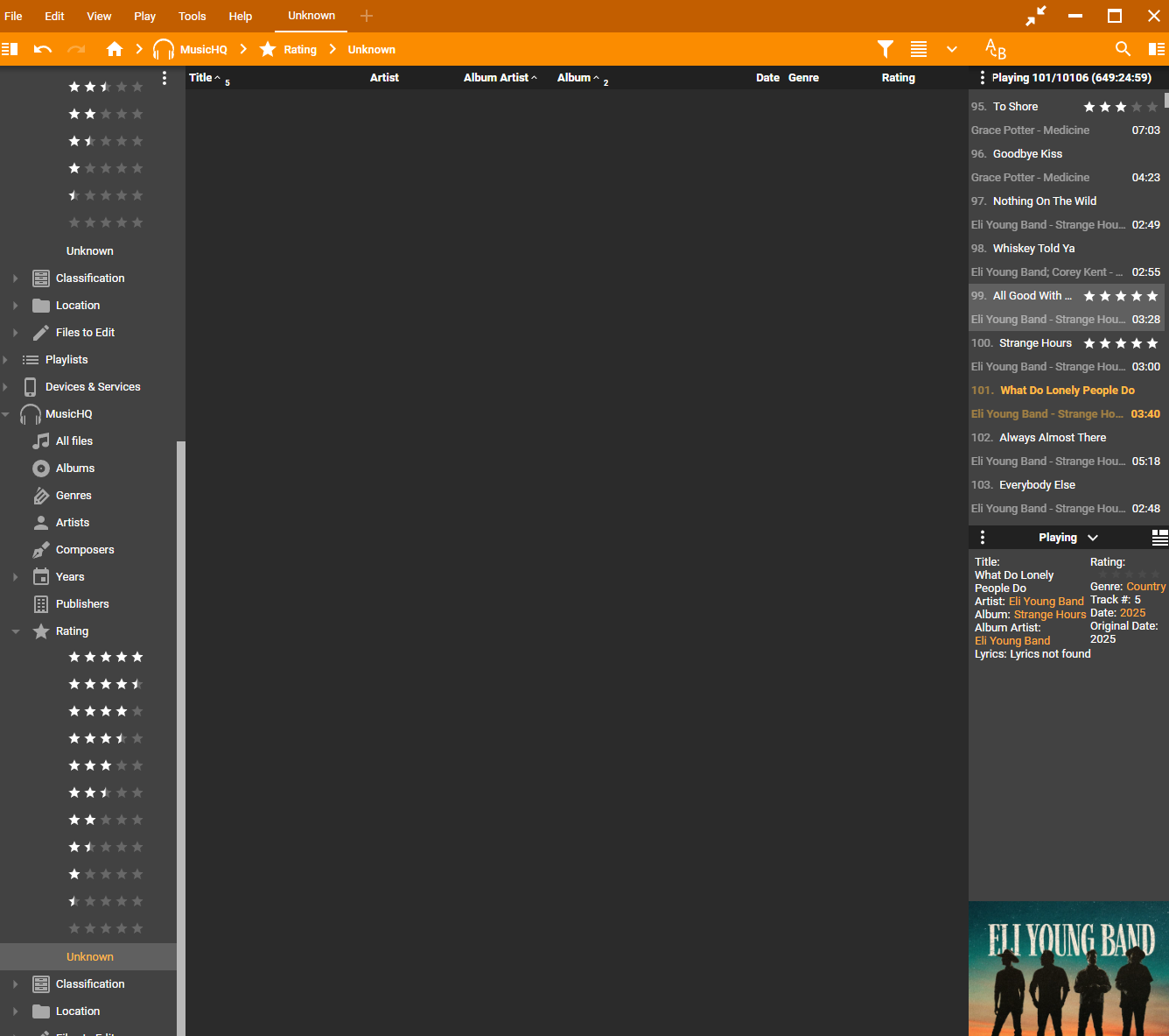 | Steps To Reproduce | 1 What Do Lonely People Do was added somewhere during playback, presumably (but unconfirmed) when Play History update was triggered 2 Other files added on playback start 3 Tagging Rating for these files removes them from View (so they seem to be added to a matching value) 4 Tagging a file in Playing with half star Rating adds it to the half rating node (so playback isn't the trigger, tagging is) 5 Only Rating seems affected, couldn't reproduce with Artist or Genre | ||||
