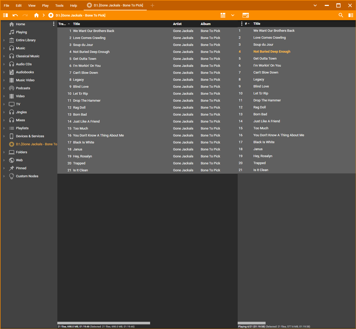 Left Side (Cyan) is selection of tracks from Burned CD Right side (Pink) is selection of files that are Burned to CD Total Time Difference is 12s eg. there is 12s of Audio missing on Burned CD. Source tracks are FLAC so Burn should be lossless eg. Burn FLAC to CD -> RIP CD into FLAC -> Audio Data from source and Ripped FLAC files should be Bit Perfect identical and there is 12s difference. |