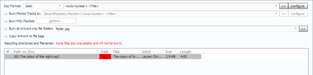 | Description | Currently, if some tracks cannot be accessed in relation to a burn, the burn proceeds for all accessible tracks and the following error results: 'Burn error: Selected tracks cannot be accessed!' This is misleading in cases where only some tracks are inaccessible. Possible fixes: a) A quick fix would be to display the following in those cases:: ----------------------------------------- | Burn Error: -------------------------------------------- | The following tracks cannot be accessed! -------------------------------------------- | Title | Artist | Filename | xxxx.xxx | xxxx.xxx |------------------------------------------- | . . . . . . . . [Back] [Burn] [Cancel] --------------------------------------------- note: burn would be greyed out if all tracks cannot be accessed b) A better fix suggested by Ludek is to automatically remove OR better yet to grey them out them directly on the Burn Wizard ("Choose Disc Format" Page for data CD and "Confirm audio CD tracks" for audio CD) and not after clicking burn to prevent burning only half of disc in case when half of tracks cannot be accessed. [I prefer the approach of greying them out because that's consistent with the way that MM works and it's clear to the user that such tracks are unavailable. | ||||