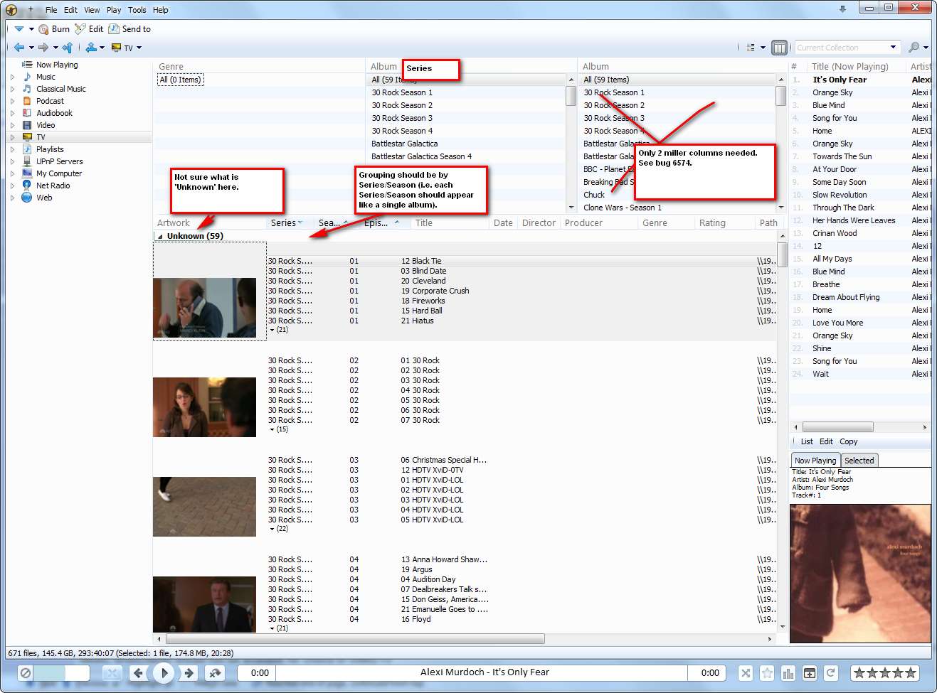 Tested 1334. Much better, but a couple of items remain: Video: -Default sort is by Date and Director. It should be by Series/Title. -Column for Series/Title isn't enabled / doesn't exist in AA view. -There seem to be 2 groups in Video: 1) Unknown 2) W That shouldn't be the case. They should be grouped by Series, otherwise not at all (i.e. just alphabetical). Though perhaps no grouping at all might be better. Playlists: The playlist 'View as' setting has no effect. e.g. Playlist set to 'Classical' doesn't appear like the Classical collection. TV: Second column should be 'Series' or 'Series/Season' rather than 'Series/Title' |