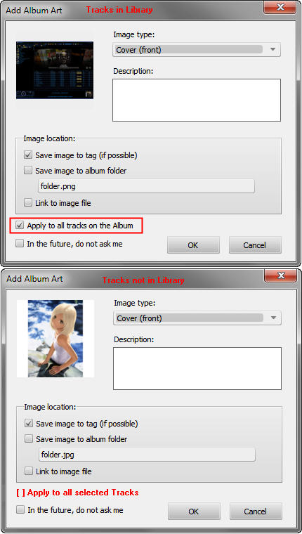 | Description | In User tries to tag multiple FLAC files from My computer Node on files that are not in Library and add new/additional Album art (Add Imade in Album Art Window or D&D Image to Album Art Window). Only First selected track gets tagged. | ||||