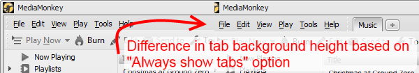 | Description | The tab background height changes based on the "Always show tabs" option at Options > Appearance. If "Always show tabs" is unchecked, then this area height decreases by 2 pixels. I can't really see any good reason why this should be. The tabs would still fit in this space with decreased height anyway, so it's not a matter of saving screen space. Further it creates an inconsistency (especially troublesome with certain tab backgrounds). I think the height here should be standardized and shouldn't change based on this option. | ||||