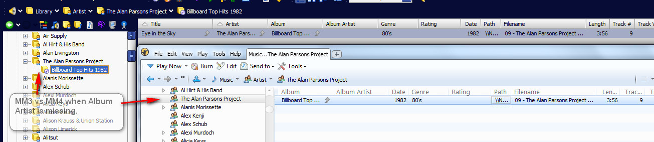 I think what Rusty is referring to is that under the 'Artist' node: 1. If the artist appears only as an Artist in the database, (not an Album artist) then the node will not expand to show the album 2. If the artist appears as both an Artist _and_ Album artist in the database, then all albums will show as a sub-node to that artist (even for tracks where the "Album artist" is 'Various' or similar You can see examples in my DB: http://www.4shared.com/file/nuGnUkgG/MM_online.html 1. Regular Music > Artists > Abbie Mitchell (node does not expand, so no Album sub-node. Album artist is various, and the artist does not appear as an album artist in the DB). Also seen for any Artist in the Artist node without an expansion indicator 2. Regular Music > Artists > matt pond PA (node expands. For the sub node "Guilt by Association, Volume 2" the album artist is Various but the album still shows) Also seen for several other artists: Max Vernon > Guilt By Association, Volume 2 Michelle Branch > Shaman |
