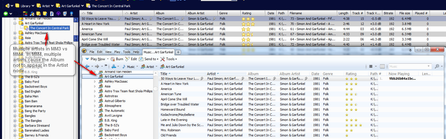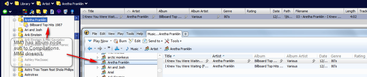 See 3 images above for differences between MM3 and MM4. Bascically, in MM4, any time there's a difference between the Artist and Album Artist (multiple artist tracks, multiple artist albums, album artist=""), the Album subnode doesn't display. |