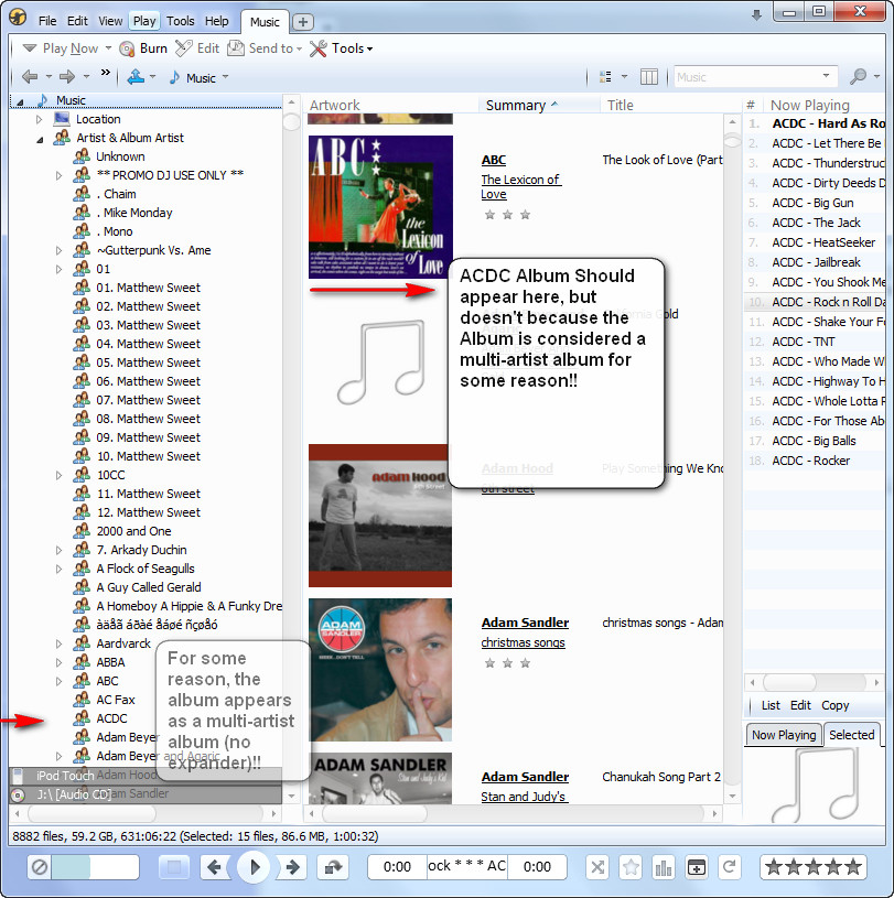 | Description | There have been numerous reports of scanning failures in which tracks are represented incorrectly in the library (missing an Album even though Artist and Album Artist exist and are identical). It turns out that the problem is specific to the file monitor. The issue was discovered in the course of testing scanning of ACDC albums which seemed to display in the tree, but not at the expected location in the tracklist (Art View / Art and Details view). See attached images and video. In contrast, when manually scanning the files, this bug doesn't occur. Could there be other differences in scanning logic between the File Monitor and Manual Scanning (e.g. could it explain some Album Art problems re. multiple art being addde)? | ||||