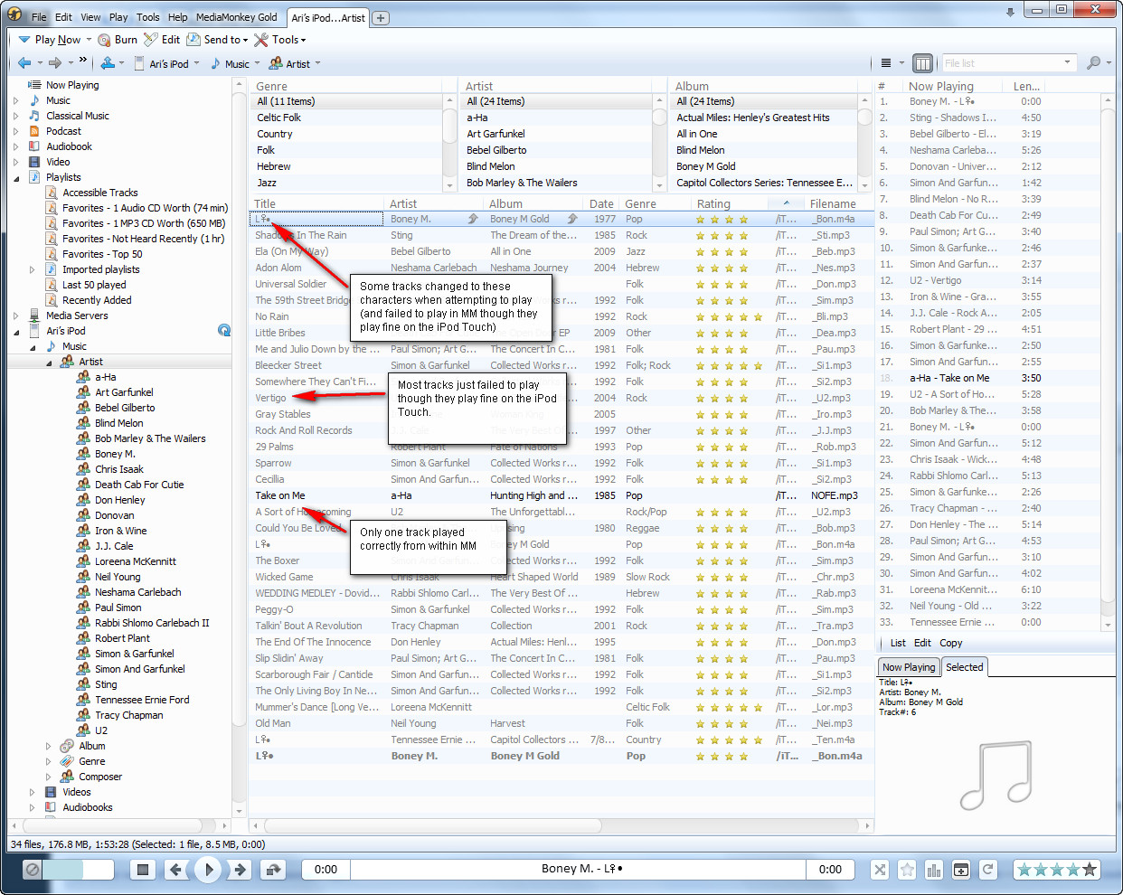 Something else I just noticed: when playing tracks via MM > iPod Touch > Music node, many tracks aren't playable. BUT, when playing tracks via MM > iPod Touch > Playlists > <playlist> node, the majority of tracks _are_ playable. What really interesting is that tracks that aren't playable via the iPod Touch > Music node (they get greyed out), are playable via the Playlist node (i.e. the tracks are syncing, it's just a DB issue)! e.g. In the iPod Touch > Music Node, 'Oh Well' by Billy Burnette is greyed out when the user attempts to play it via MM from the iOS device. But, when the exact same track is double-clicked via iPod Touch > Playlists > Testlist, it plays as expected! |