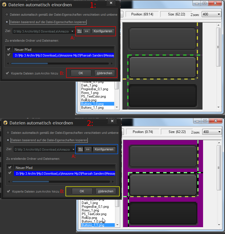 | Description | 1. As reported by DreadM that Auto-Organize Dialog button objects are not drawn with transparency. Example 2: from Attached picture Original DreadM description: --- example 1: (top) button elements A: and B: (in Red) they use the same Skin object , defined in the theme editor under Objects / Button, in this example i use a colored background image for the button objects (you can see at right side) everything works fine. The problem is that this button object are display in different windows, where can have different background colors and thus need for transparent button background! example 2: (below) when i use a Button image with transparent background for the Button object (you can see at right side) the buttons on the bottom B: (In Yellow) displays correct, but not the upper buttons A: (In blue) They have a black background --- | ||||