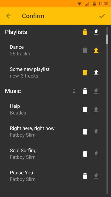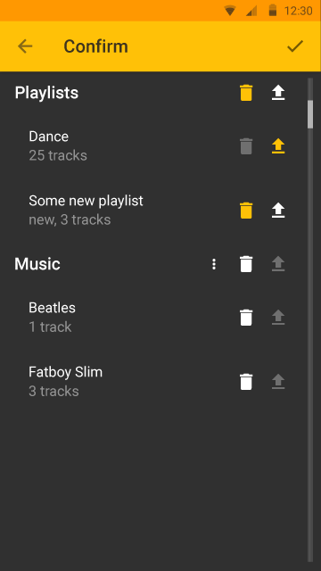 Yes, you are correct. But it works exactly the same way in current implementation too. Delete tab contains both tracks for upload and deletion. Btw. "cancel" button is not the only option - the simplified dialog scenario (as described above) can do it too. Outline icons are not used in material design. Primary (orange) colour or secondary (not set for our theme yet) is used for activated/checked icons. It is the same approach as for repeat and shuffle controls. We should really choose the UI from confirmation1.png ... It uses commonly used design so I don't think that users will be confused. (More info here: https://material.io/guidelines/components/buttons.html#buttons-toggle-buttons) There are not 4 states, only 3 states as I described above. I think that the hierarchy is correct. All the playlists that can be deleted are selected so parent is selected too. Dance playlist is on synclist and changed on MMA side and can be only uploaded to MMW. That is why I wanted to hide the icon if the state is not possible. |