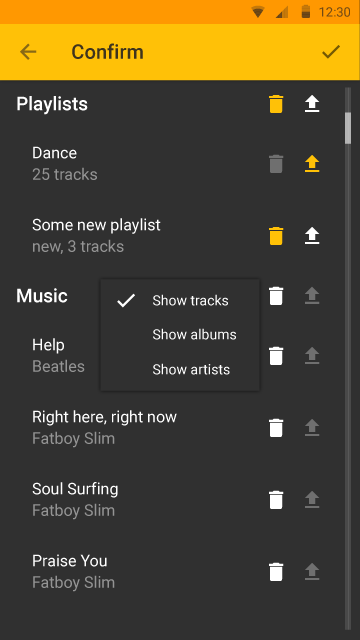 c) yes, each group (Music, Playlists, ...) has the same icons as particular items and user can select the action for whole group at once. The example screenshots shows the situation where deletion is checked for all playlists that need confirmation for deletion - 1 playlist called "Some new playlist" Re.Note : yes, it will remain the same as it is currently in 1.2 |