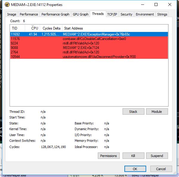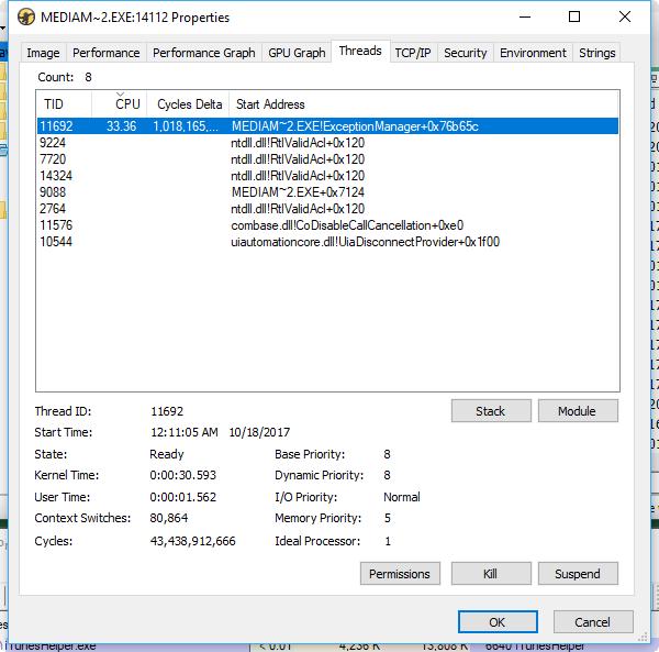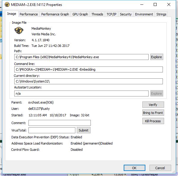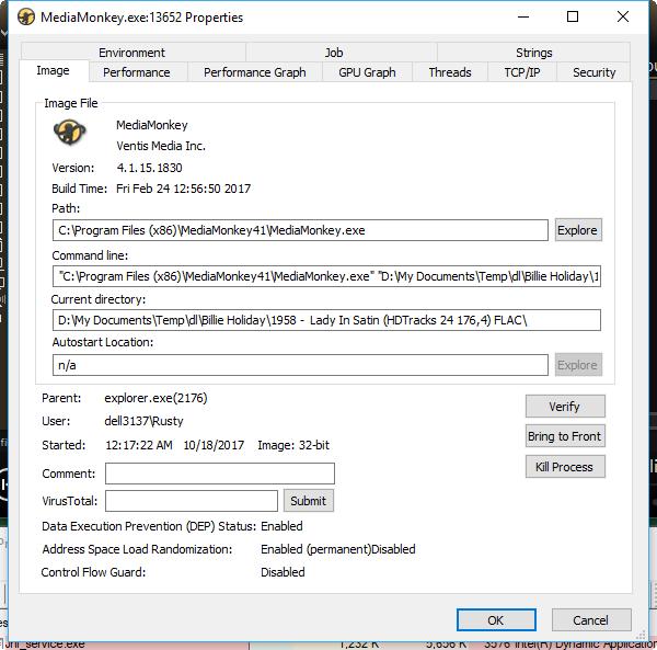 The bug still occurs with 1855: I sent an elog entitled "bug 0012838 with build 1855" Debugview log attached. fyi, I just noticed something else: After right-clicking 'Play Now in MediaMonkey' then the ELog is sent and Process Explorer shows "MEDIAM~2.EXE" running at 45% CPU utilization for 90s at which point it changes to "MediaMonkey.exe" and MediaMonkey launches/plays. |
