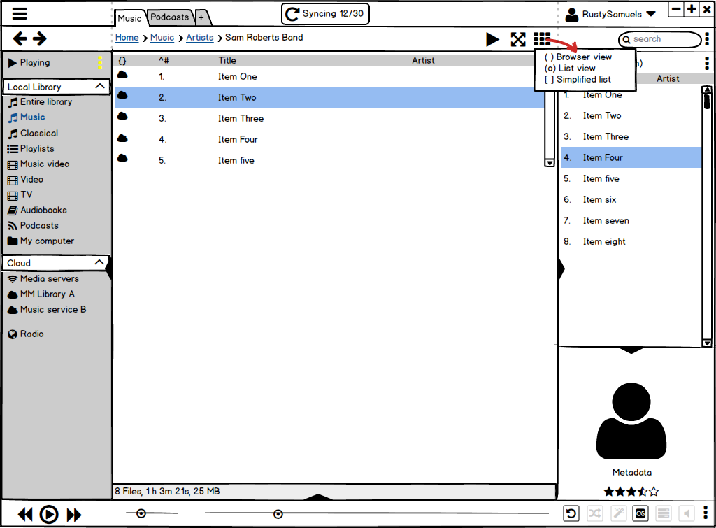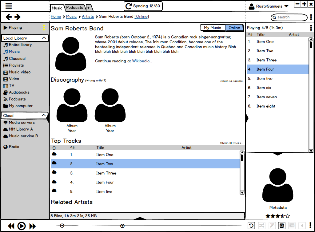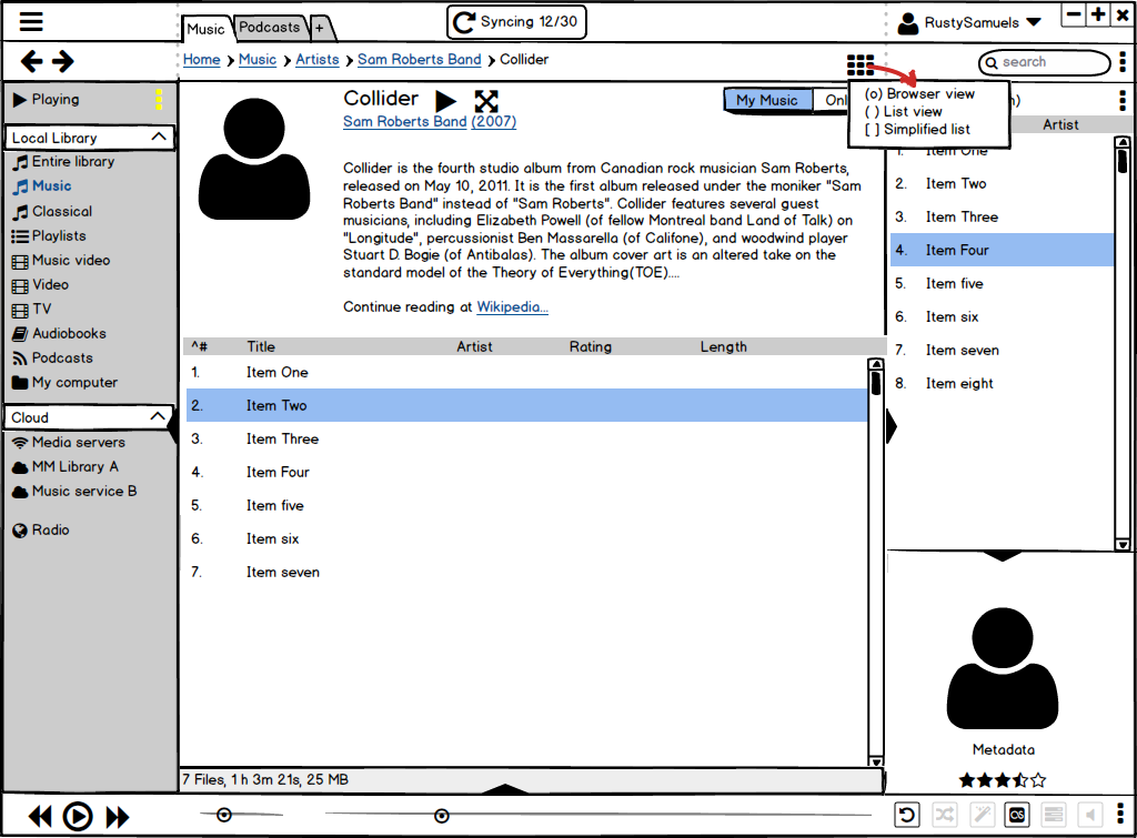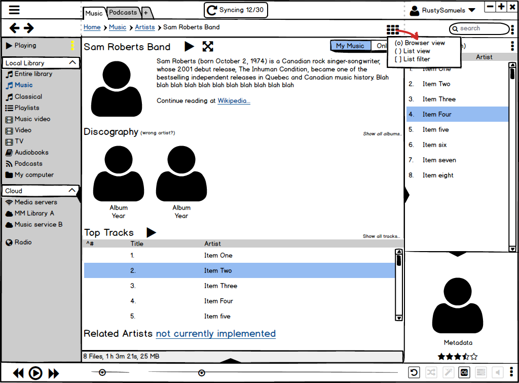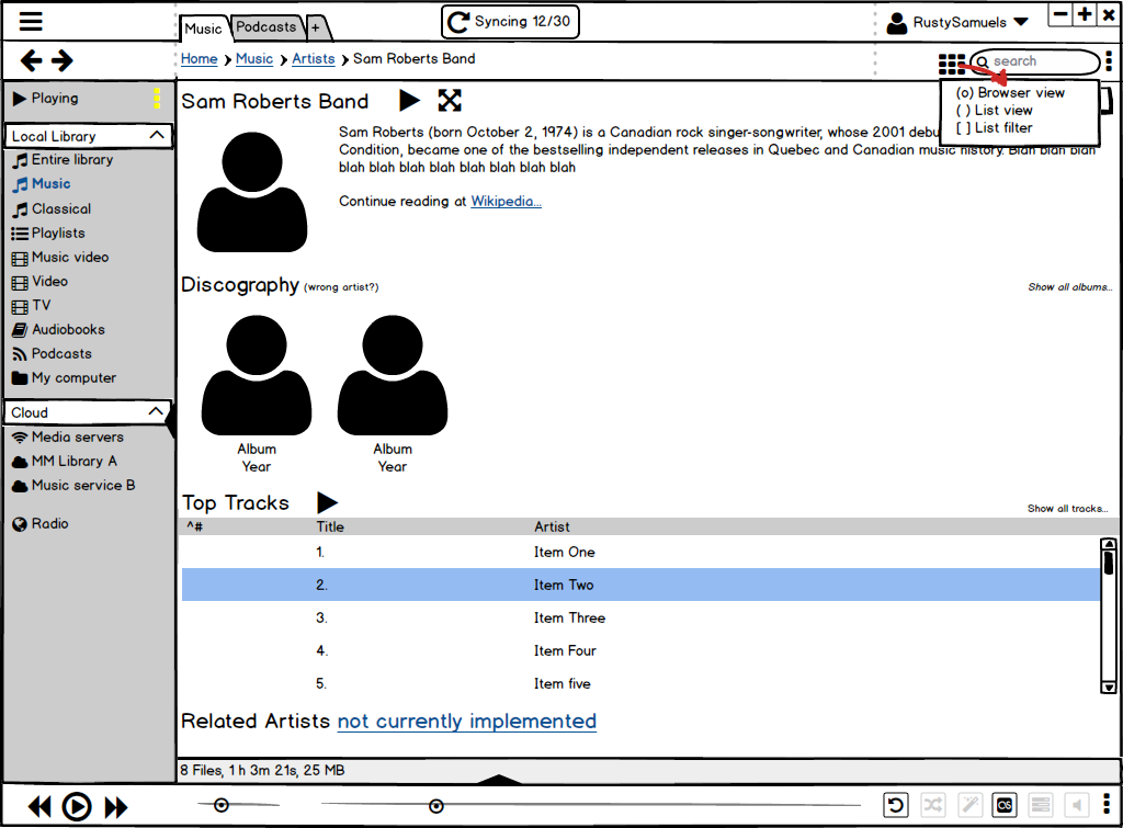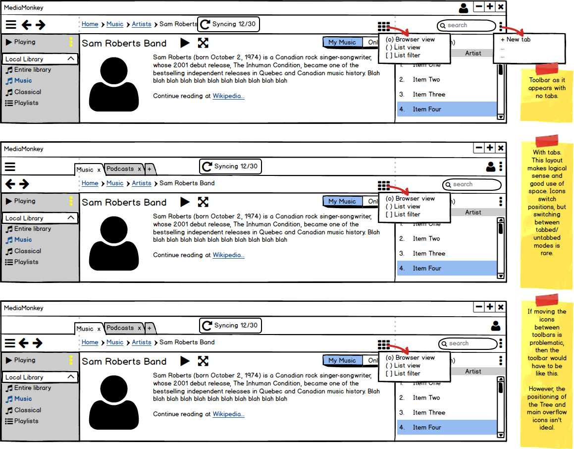 | Description | The current toolbar/titlebar/tab bar arrangement can be improved so that: a) it takes up less space (e.g. the title bar wastes a lot of space) b) icons are arranged so that they're aligned with the portion of the UI that their functionality affects (e.g. tracklist view selector should be near the tracklist). This can be accomplished as follows: i) Combine the title bar with the tab bar (as in MM4). If the user doesn't use tabs, then the tab bar will appear empty as MM5 currently does, with the '+' button hidden in the overflow menu OR the main UI can appear as a tab with a single '+' button next to it (as in Chrome). ii) To better align icons, the UI can be divided into 3 regions as shown in the mockup and that the different icons are aligned as shown (it's similar to the approach taken in gmail on a tablet in landscape mode). Note that when the NP (or the tree) is hidden, the icons that are right justified move to the right, while those that are left-justified move to the left. See the attached images. | ||||