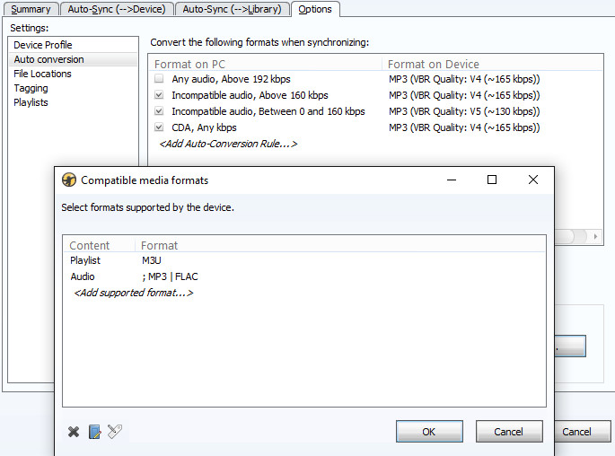 I attached Screen Shots at the time Log was created and left as current settings. Strange is that Log shows PLA even M3U is clearly set. After sync if I use Tree to navigate to playlists they are populated until device is reconnected and then playlists are empty. WMP can't sync FLAC. |