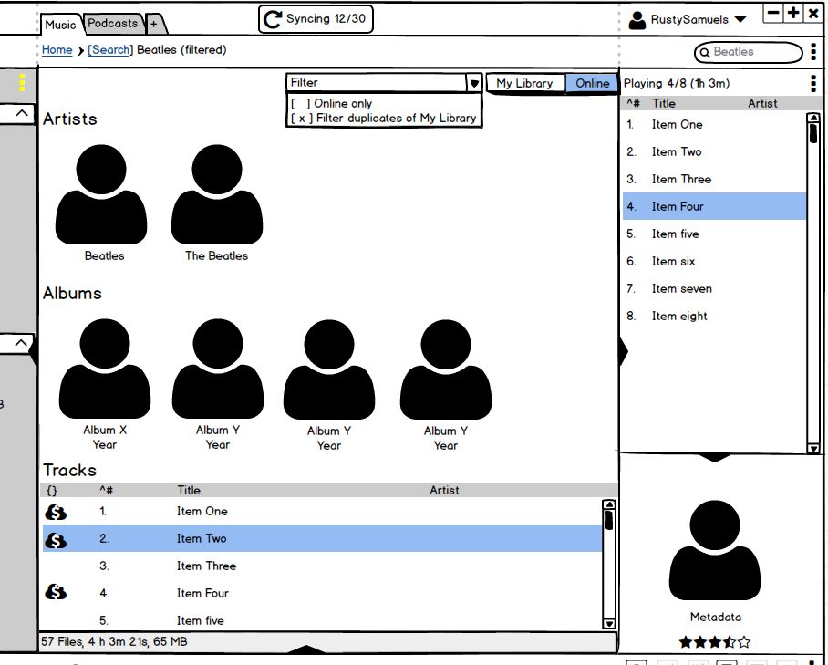 Attached is an indicator of what this could look like: a) see the filter button at the top (alternatively it could open a section of the UI similar to how filter works in My Library). b) Content has a 'cloud' indicator if it's online (note: musicbee does something similar if you want to see this in action). Whenever we implement purchase functionality, this icon could form the basis of it, but for now it just gives an indication of the source of the content. |