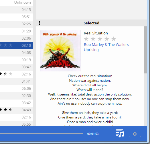 Looks good, just: 6) re. font size - it probably should share the default skin font size? 7) I'd add some padding around all the text, so that it isn't touching borders of the control. 8) Bug: After lyrics search, lyrics is found, but 'lyrics: ' label is missing, until a new track is shown. Btw, I'd prefer the Lyrics: label centered and possibly with an empty line above it? 9) I wonder whether header of the control shouldn't match e.g. Now Playing header, i.e. to only show 'Artwork & Details' (or better just 'Details'?) and a menu icon (3 dots) where user could switch between Selected and Now Playing. Note that the menu could also offer to hide all the texts, so that artwork is better visible. |
