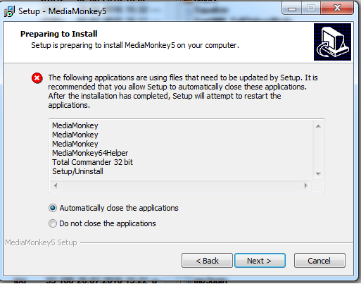Yes service is closed but in case of multiple MediaMonkey.exe and helper exe started Installer complains. Where along normal Service stop it should send CLOSE to running UI and if fail send KILL process command. In MM5 it can happen that playback process thread is still playing while UI is crashed. In MM4 and MM5 All MMW processes should be Killed on Install and Close All existing processes should be killed/Force closed |