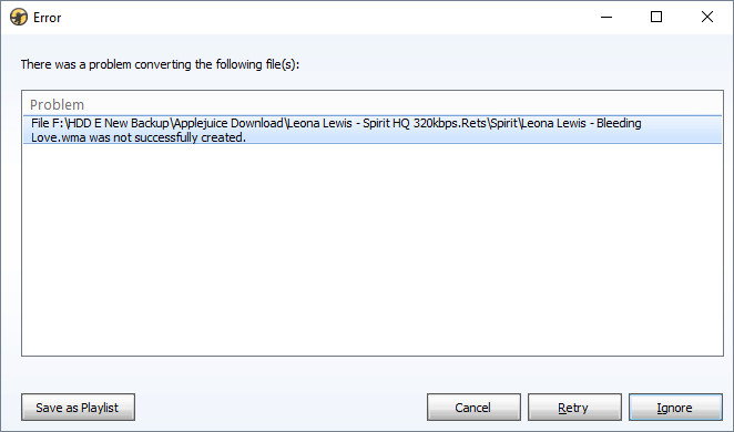 Original fix and dialog showing Verified 1810 Reopen as after that dialog MMW show list of failed tracks with generic info "?????.wma was not created successfully" I would also append string from error dialog to be more verbose and clear "?????.wma was not created successfully WMA (<OS Name> <Version>) - Not Supported!" |